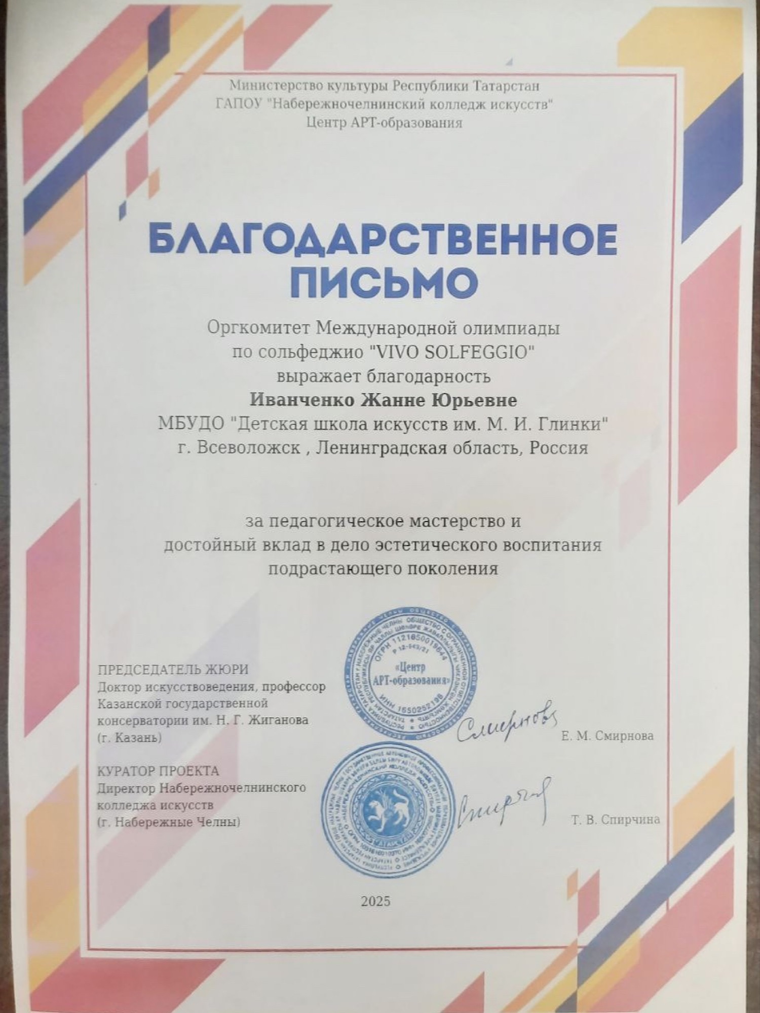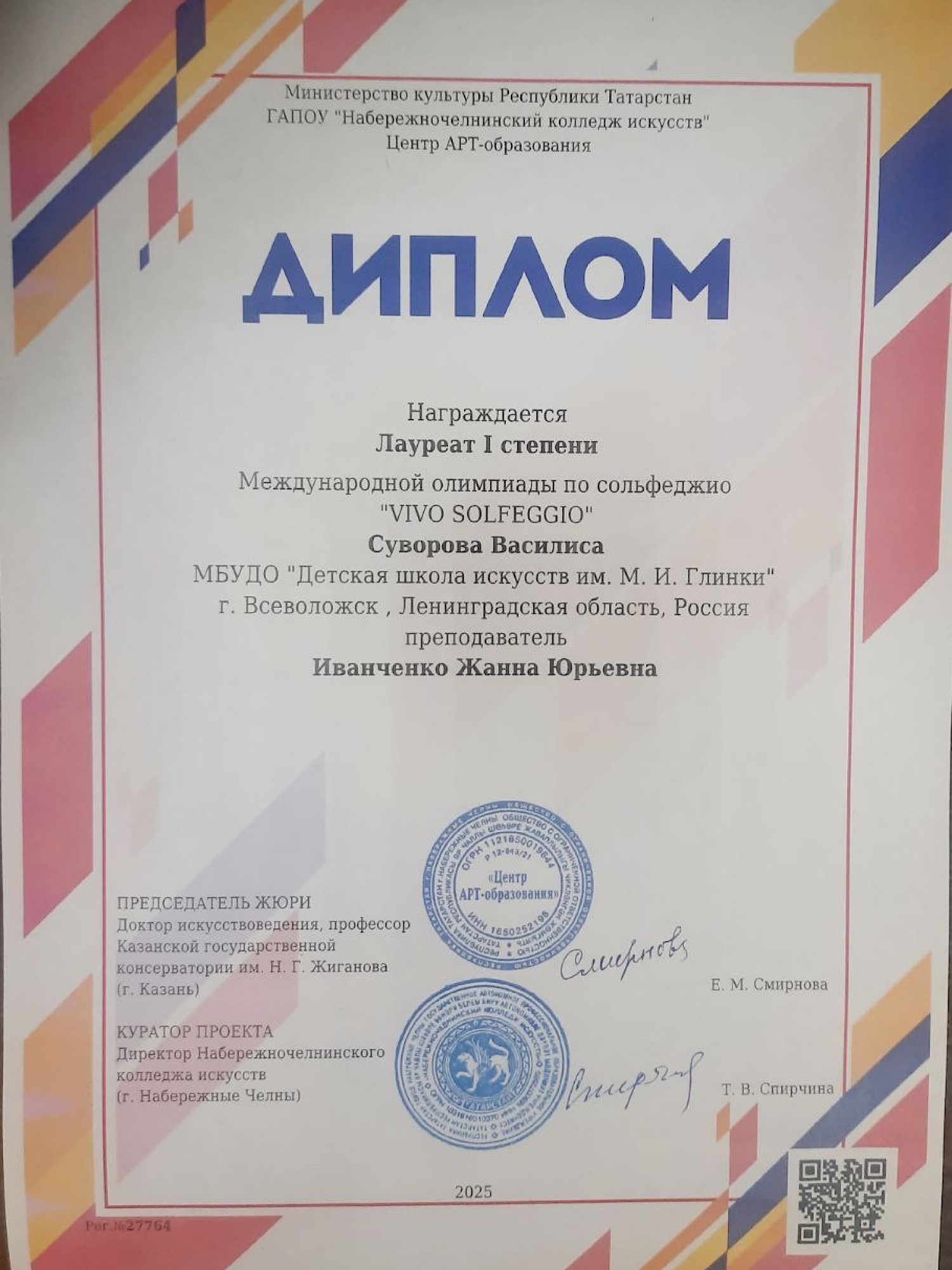 Поздравляем с победойПоздравляем с победой в Международной олимпиаде по сольфеджио "VIVO SOLFEGGIO" обучающуюся 6 класса Суворову Василису: ДИПЛОМ ЛАУРЕАТА 1 СТЕПЕНИ. Преподаватель Иванченко Жанна Юрьевна награждена Благодарственным письмом за педагогическое мастерство.
