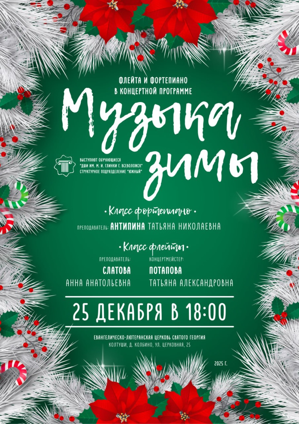 25 декабря состоялся отчетный новогодний концерт обучающихся музыкального отделения "ДШИ им. М.И. Глинки г. Всеволожск" (структурное подразделение «Южный») в евангелическо-лютеранской церкви Святого Георгия.