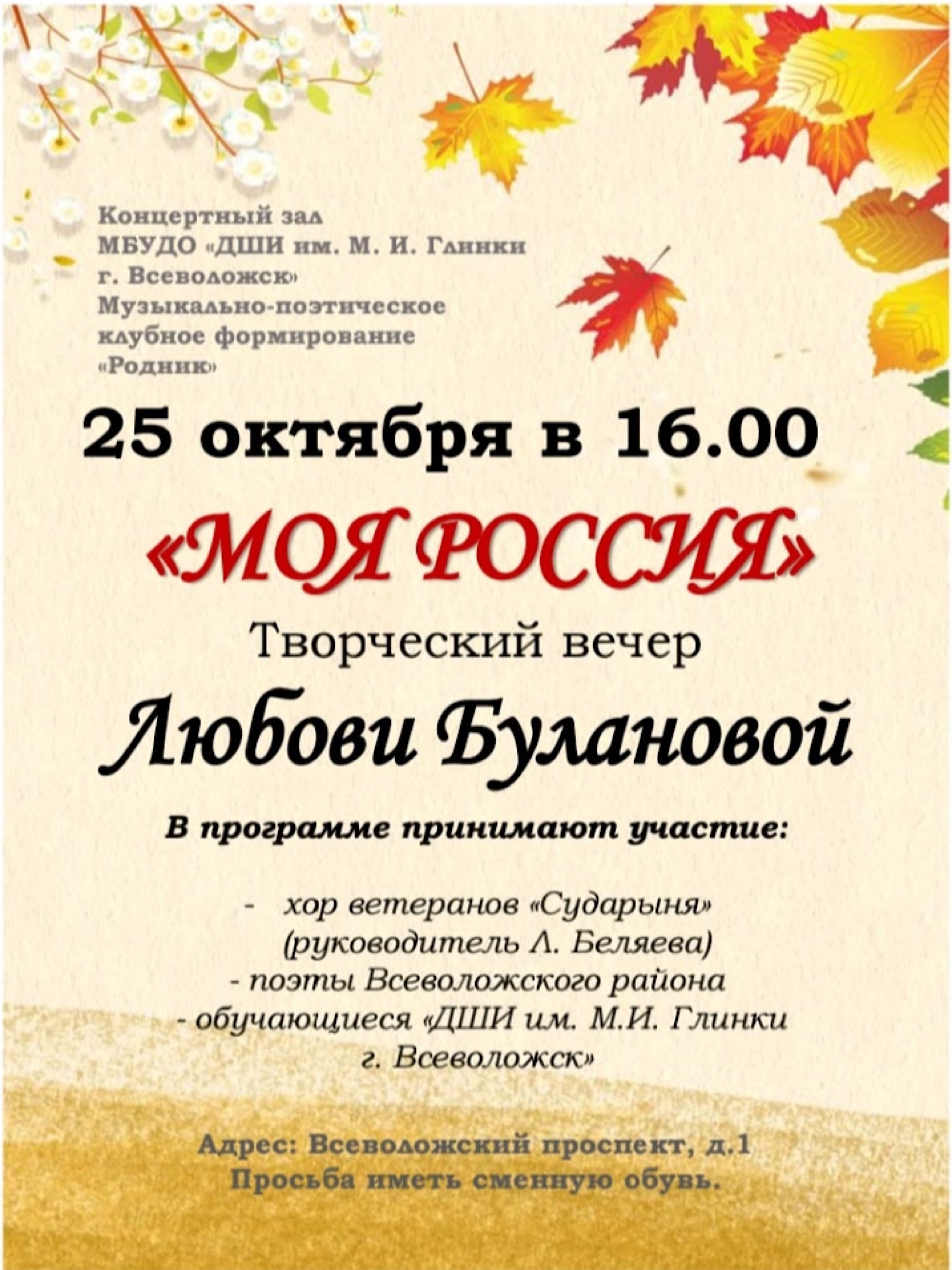 12 октября в концертном зале Детской школы искусств им. М.И. Глинки г. Всеволожск прошла творческая встреча "Всеволожская ЗЕМЛЯ ГЕРОЕВ в песнях и стихах", в которой прозвучали стихи всеволожских поэтов Владимира Шемшученко, Вячеслава Юрочкина, Олега Мохова, Галины Гальциновой, Льва Дмитриева, Любови Булановой, Виктора Каштанова, Ирины Ячменевой.