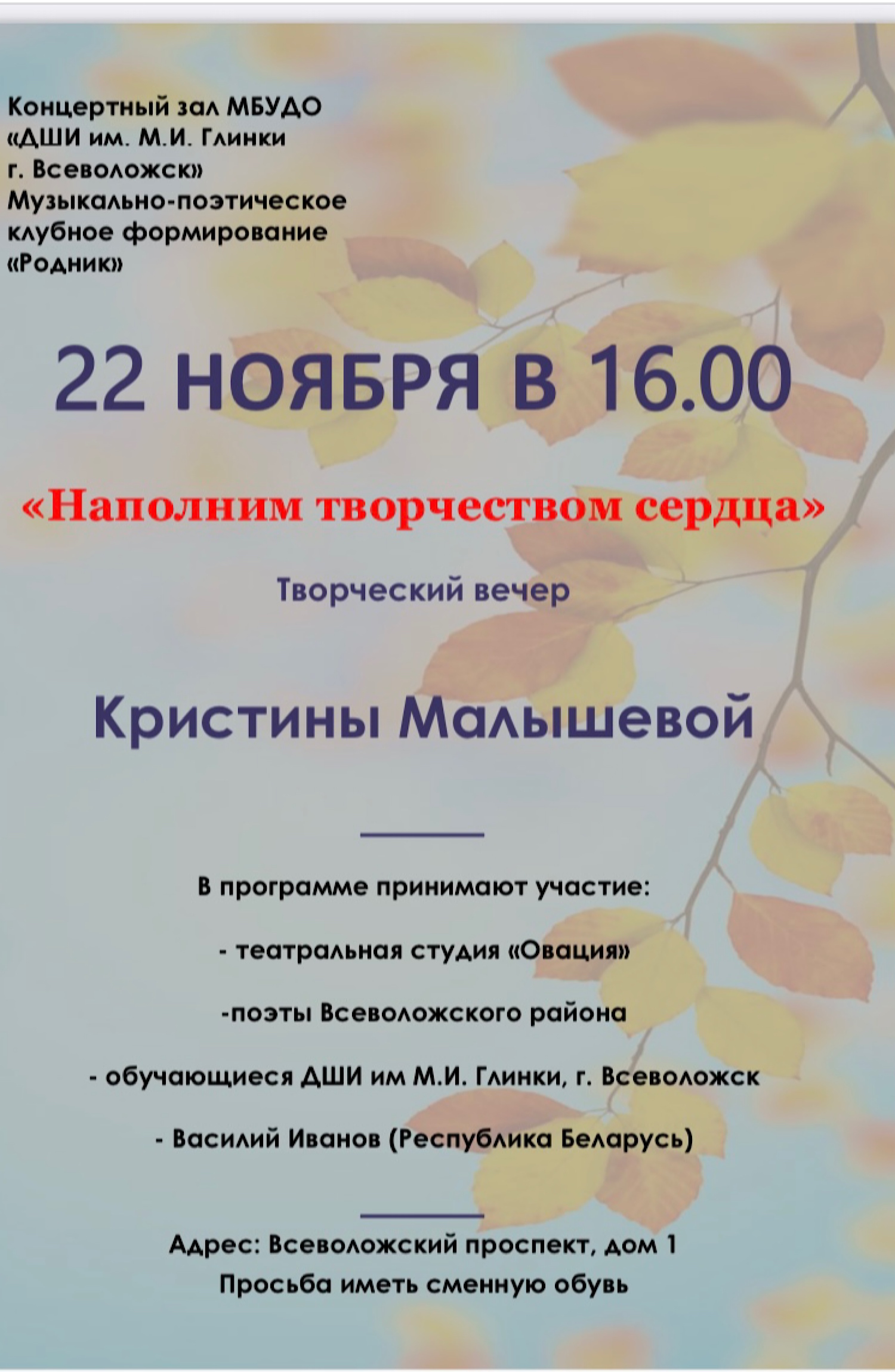 9 ноября в концертном зале ДШИ им. М.И. Глинки г. Всеволожск прошел творческой вечер Светланы и Амины Бойко «Когда поет душа!». Удивительный семейный дуэт мамы и дочери покорил зрителей своей душевностью и домашним теплом. Обе исполнительницы проживают в Янино, но уже неоднократно принимали участие. в творческих встречах музыкально-поэтического салона «Родник».