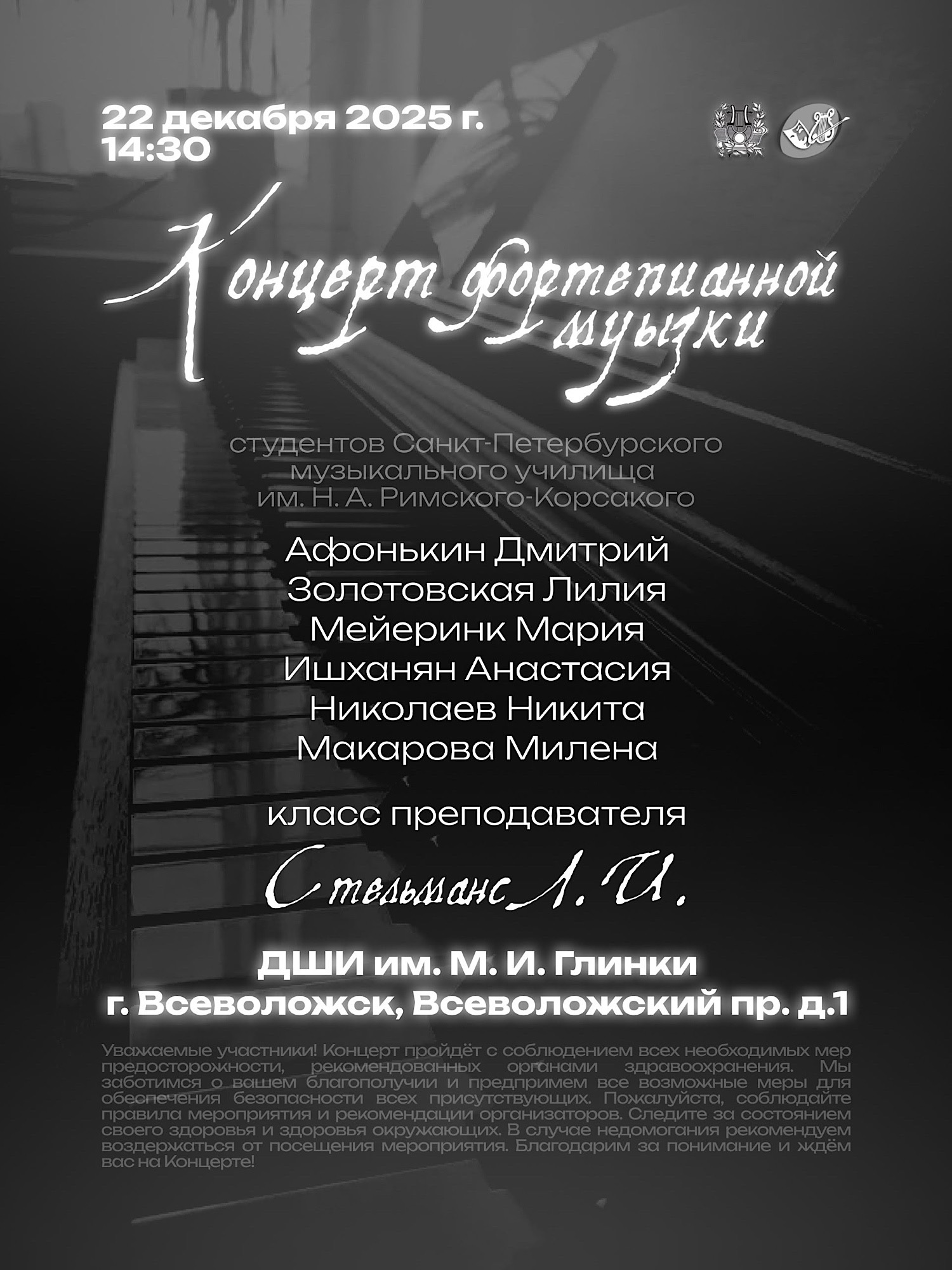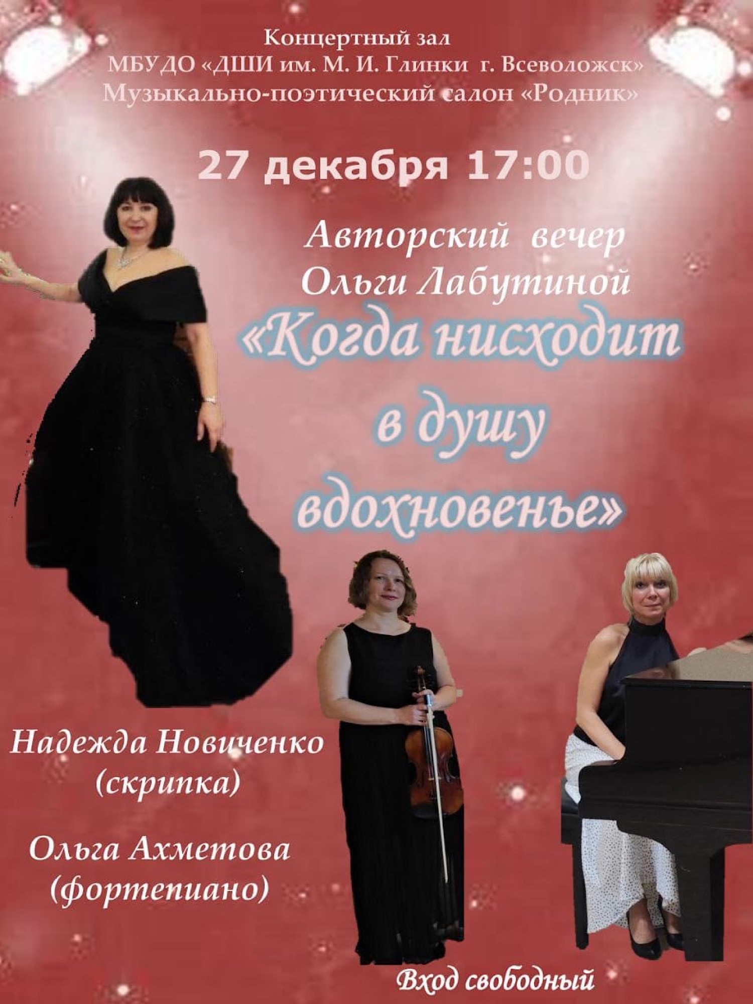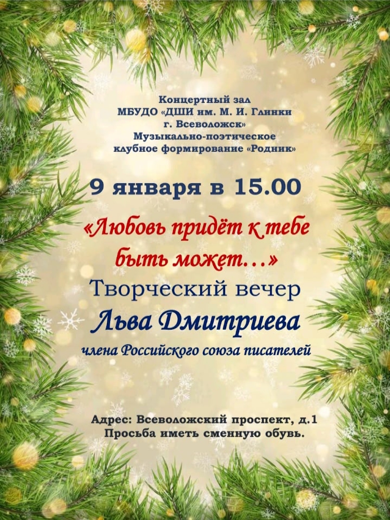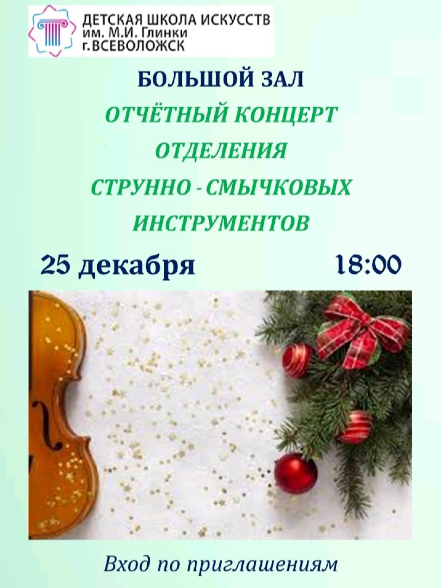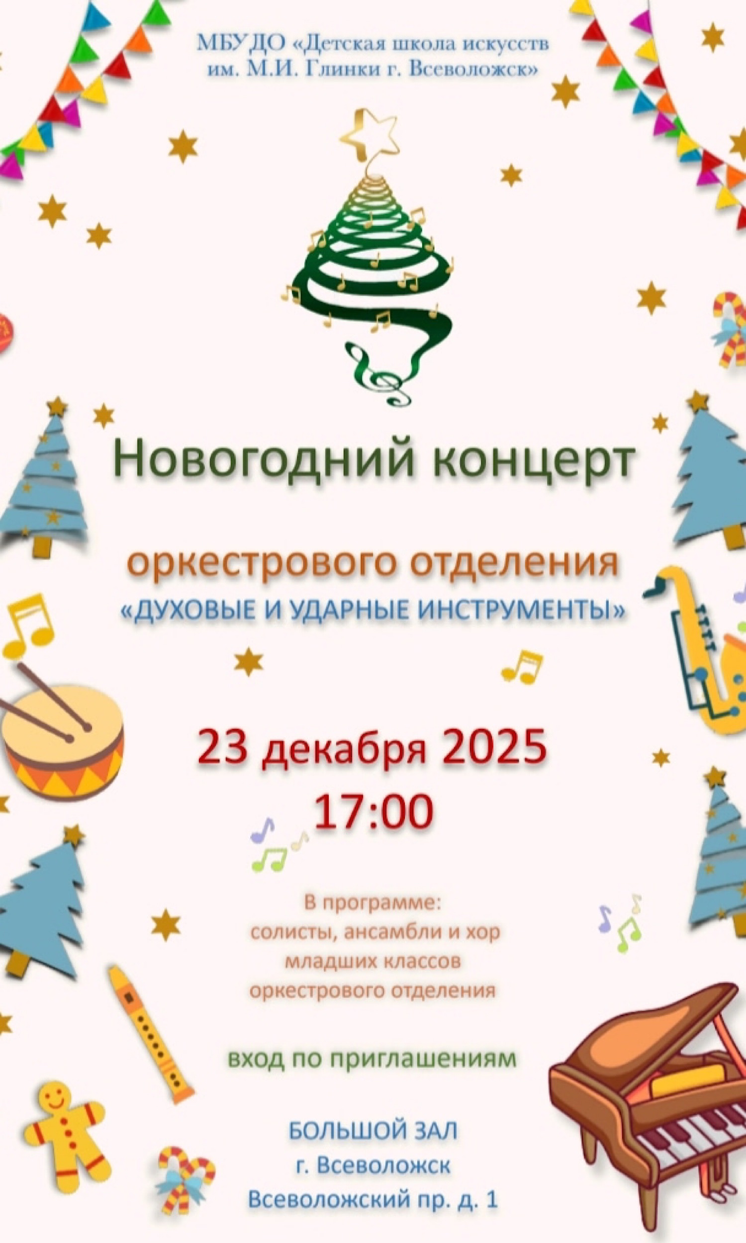 17 декабря в КДЦ «Южный» состоялся праздничный концерт «Новогодний серпантин» «ДШИ им. М.И. Глинки г. Всеволожск» (структурное подразделение «Южный»). В концерте приняли участие обучающиеся и преподаватели музыкального, фольклорного и хореографического отделений. Программу составили прекрасные ансамблевые, сольные, хоровые и танцевальные номера.