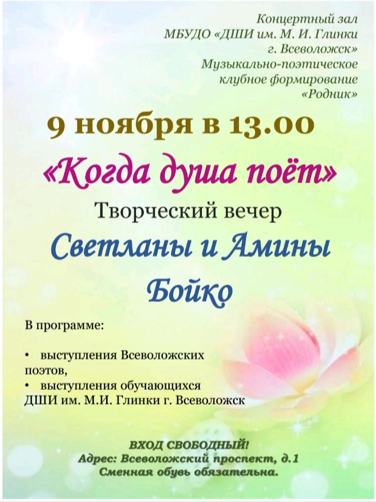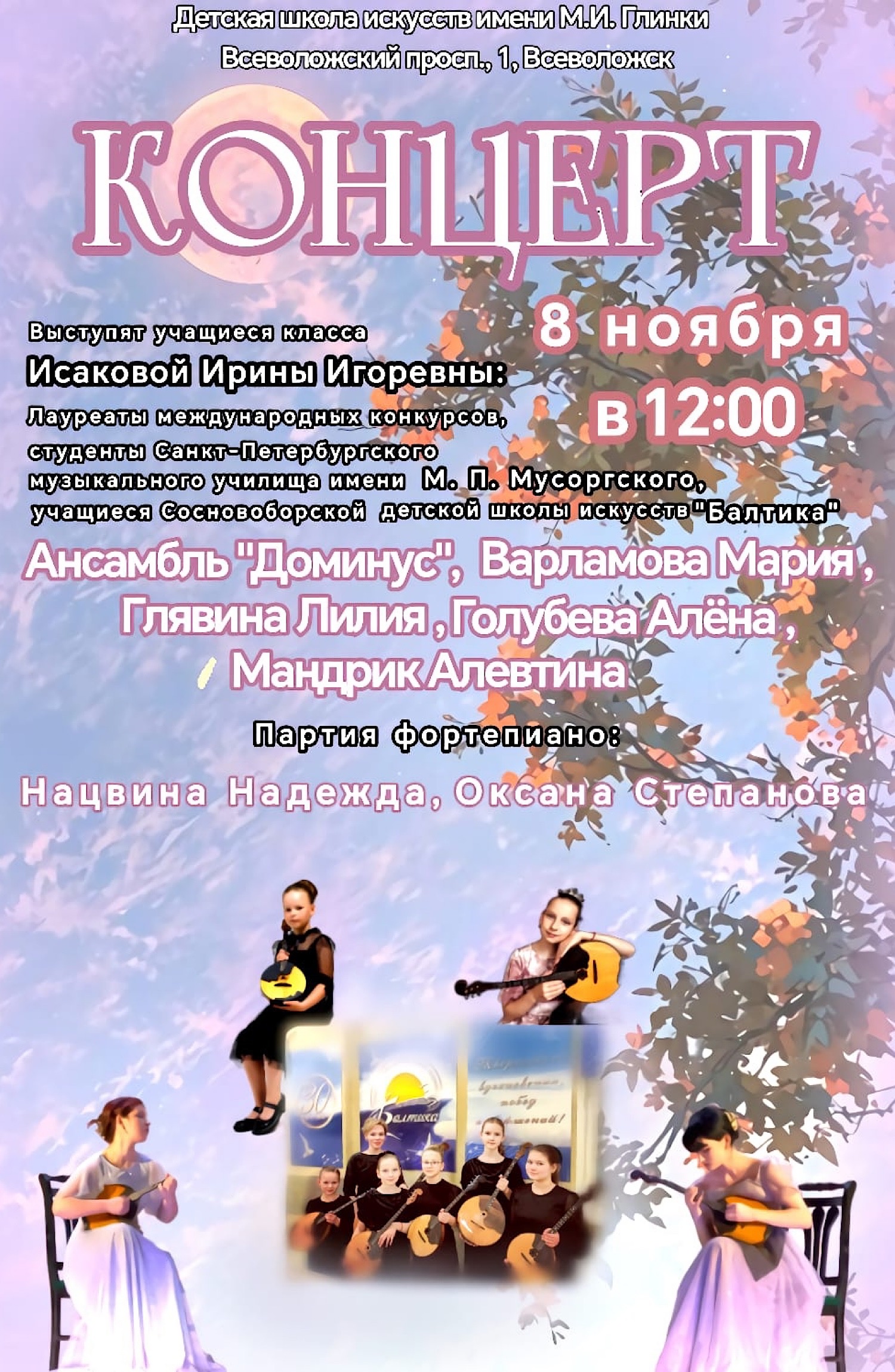 26.10.25 состоялся "Учебно-Восхитительный" концерт учащихся ДШИ им. М.И. Глинки г. Всеволожск и ДШИ им. И.О. Дунаевского (Рахьинское подразделение), в котором принимали участие 6 преподавателей (Полагаева Н.Б., концертмейстер Рябко А.М., Хотакко С.С., Хомичко Г. Я., Стаценко Г. Р., Шофман Л. Р. ) оркестрового и фортепианного отделов, подготовивших к концерту 25 учащихся разных возрастов (от 6 и до 15 лет).