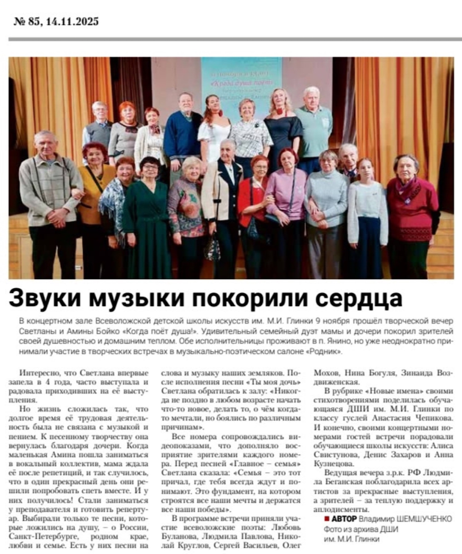 9 ноября в концертном зале ДШИ им. М.И. Глинки г. Всеволожск прошел творческой вечер Светланы и Амины Бойко «Когда поет душа!». Удивительный семейный дуэт мамы и дочери покорил зрителей своей душевностью и домашним теплом. Обе исполнительницы проживают в Янино, но уже неоднократно принимали участие. в творческих встречах музыкально-поэтического салона «Родник».