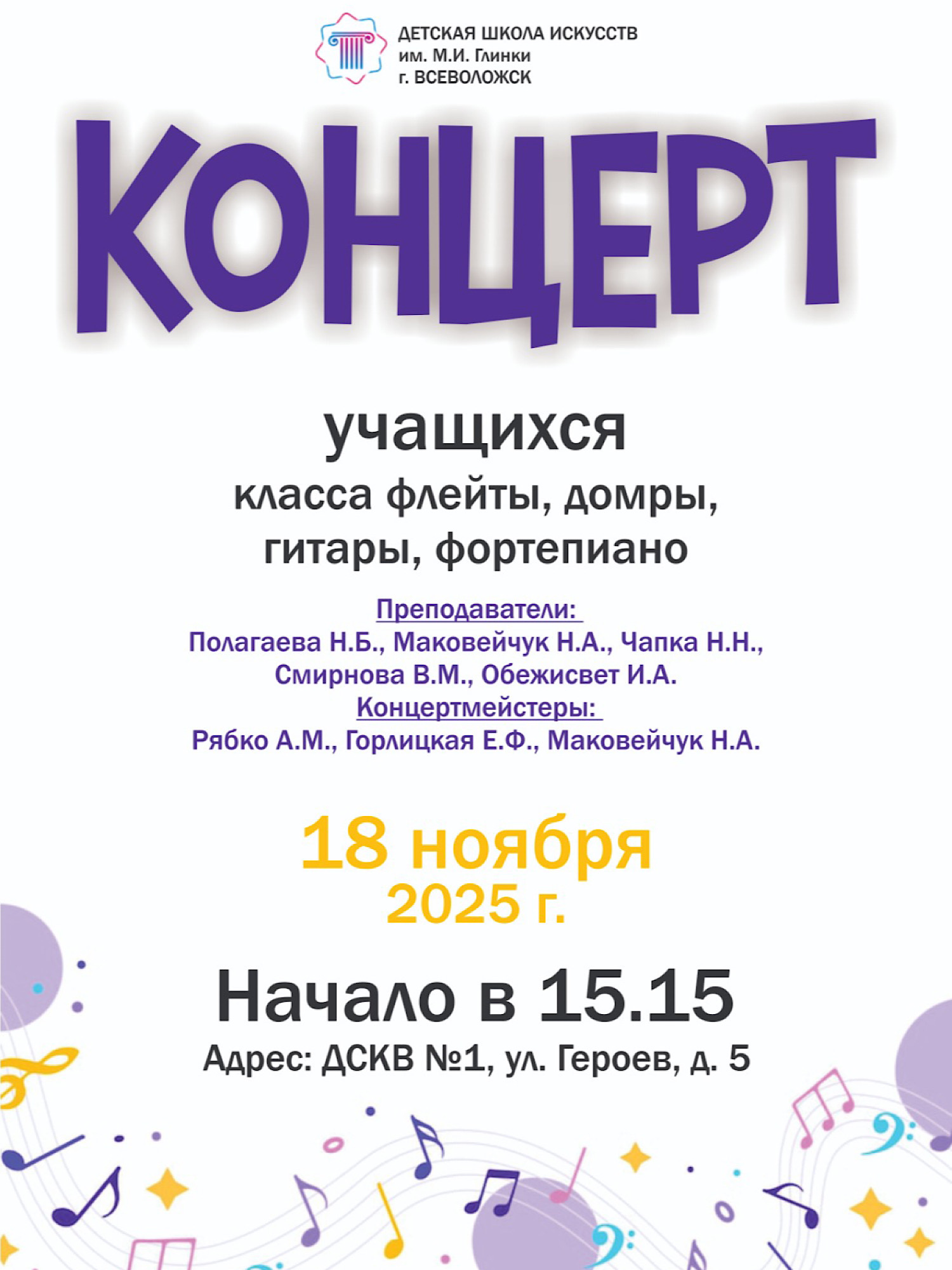 8 ноября в концертном зале МБУДО "ДШИ им. М. И. Глинки г. Всеволожск" прошел замечательный концерт учащихся и студентов класса домры Исаковой Ирины Игоревны из Сосновоборской детской школы искусств "Балтика" и Санкт-Петербургского музыкального училища им. М. П. Мусоргского.